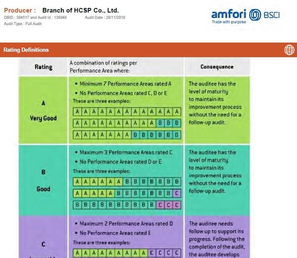 Chúng nhận BSCI phù hợp với các Công ước ILO, Công ước Quốc tế về Quyền Con người của Liên Hiệp Quốc, Công ước của Liên Hiệp Quốc về quyền trẻ em và về việc loại bỏ tất cả các hình thức phân biệt đối xử đối với phụ nữ, Bản khế ước Toàn cầu của Liên Hiệp Quốc và Hướng dẫn của OECD dành cho các Doanh nghiệp Đa Quốc gia và các Hiệp định quốc tế liên quan khác, Bộ Qui tắc Ứng xử của BSCI nhằm hướng đến đảm bảo sự tuân thủ với các tiêu chuẩn xã hội và môi trường cụ thể.